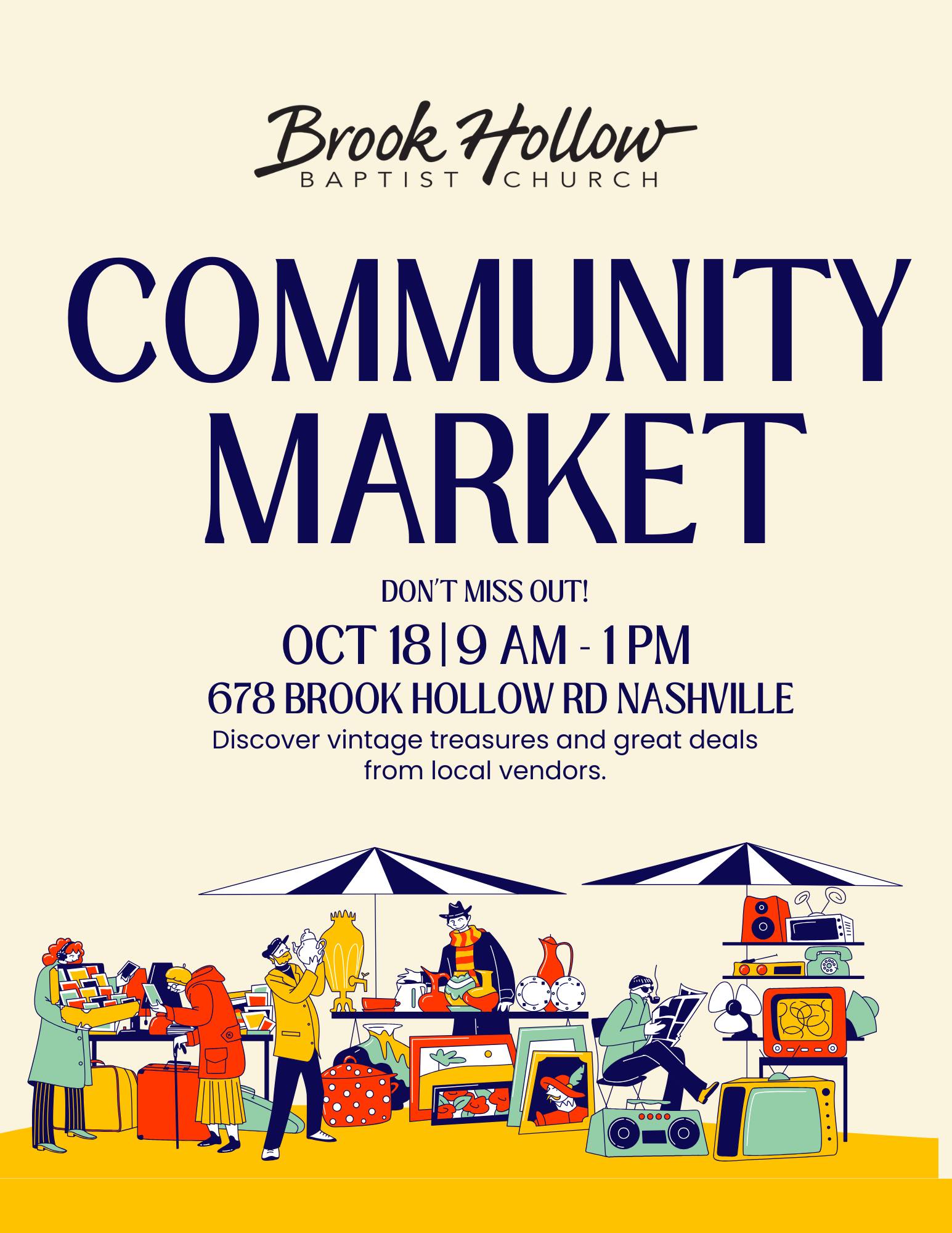 Brook Hollow Baptist Church is hosting a Community Market on Saturday, October 18th, from 9 am to 1 pm, and they would love for you to attend!